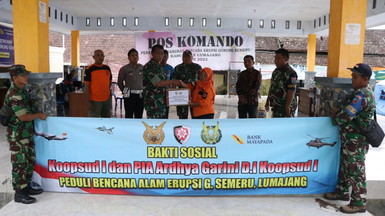 Lumajang, Jurnaljakarta.com – Peduli bencana alam, Koopsud I distribusikan bantuan sosial bagi masyarakat terdampak bencana erupsi Gunung Semeru yang terjadi pada 4 Desember 2022 yang terpusat di wilayah Dusun Kajar Kuning, Kelurahan Sumber Mujur, Kecamatan Candipuro, Kabupaten Lumajang, Jawa Timur, yang langsung didistribusikan di lokasi tersebut. Jumat, (16/12/2022).
