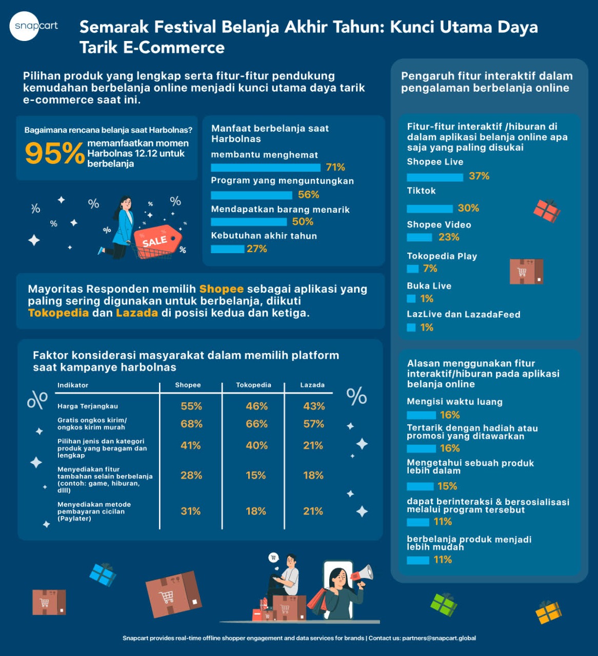 Dari beberapa fitur-fitur interaktif yang dikenal, pada riset Snapcart telihat sebanyak 37% responden memilih Shopee Live sebagai fitur yang paling disukai. Posisi berikut nya terdapat Tiktok (30%), Shopee Video (23%), Tokopedia Play (7%), dan (1%) untuk BukaLive, LazLive dan LazadaFeed. Terdapat berbagai alasan yang mempengaruhi pemilihan penggunaan fitur, menariknya 5 alasan utama konsumen menyukai fitur-fitur interaktif yang dihadirkan adalah untuk mengisi waktu luang (16%), tertarik dengan hadiah atau promosi yang ditawarkan (16%), mengetahui sebuah produk lebih dalam (15%), dapat berinteraksi dan bersosialisasi melalui program tersebut (11%), dan berbelanja produk menjadi lebih mudah (11%).