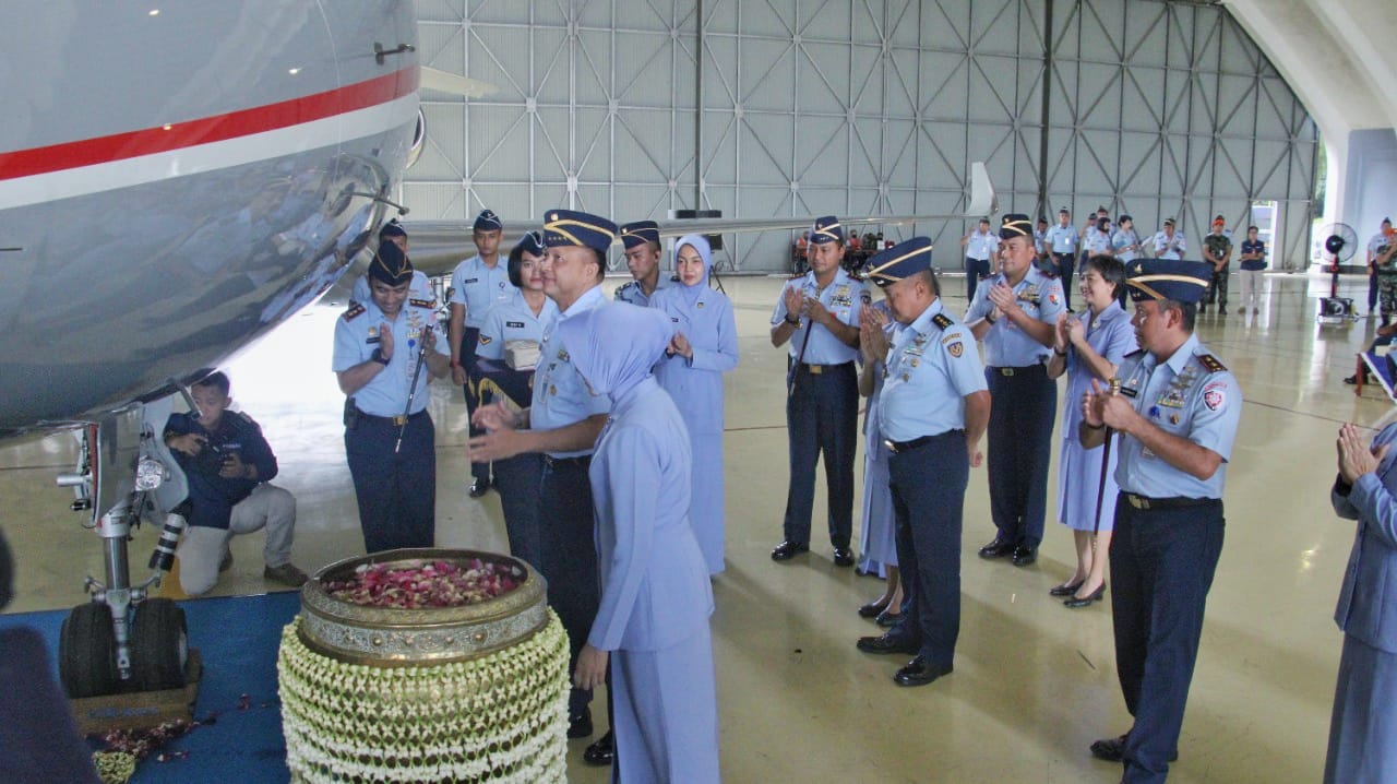 Kegiatan tersebut diawali dengan pembacaan doa dan dilanjutkan peresmian dengan tradisi pelepasan stiker logo Skadron Udara 17 dilanjutkan pemecahan kendi dan penyiraman bunga di kedua pesawat Falcon 7X dan 8X yang didampingi oleh Ibu.