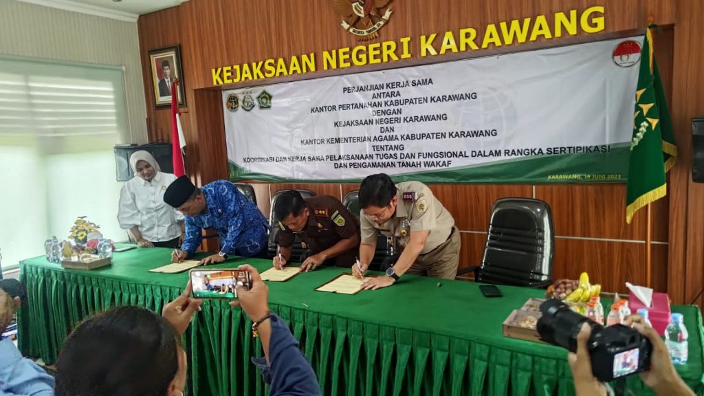 Karawang, Jurnaljakarta.com – Bertempat di Kantor Kejaksaan Negeri Karawang dilakukan Memorandum Of Understanding (MoU) atau Perjanjian Kerjasama untuk 3 Instansi (red-Kantor Pertanahan Kabupaten Karawang, Kejaksaan Negeri Karawang dan Kantor Kementerian Agama Kabupaten Karawang) tentang Koordinasi dan kerjasama pelaksanaan tugas dan fungsi dalam rangka percepatan sertipikasi dan pengamanan tanah wakaf, Senin (19/6).